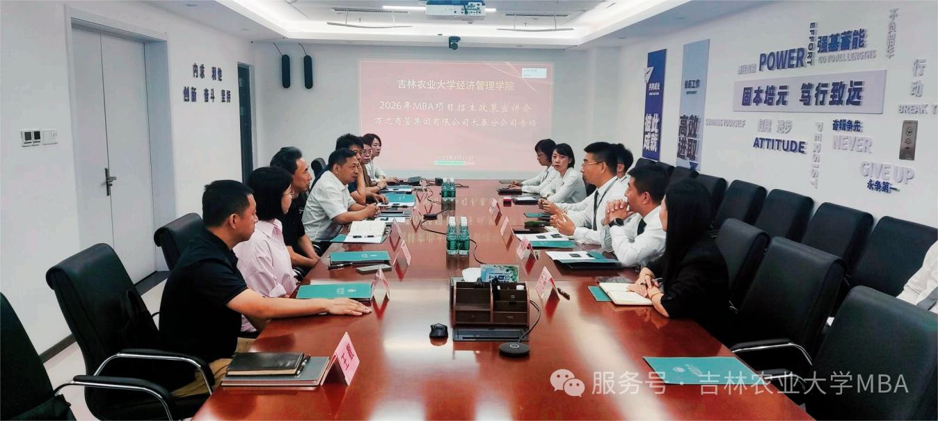 9月11日,吉林农业大学MBA教育中心赴珠海万达商管集团长春城市公司,开展2026年MBA项目招生政策宣讲活动。吉林农业大学经济管理学院党委书记张万志、副院长赵贵玉、副院长兼吉林农业大学MBA教育中心主任杨兴龙,以及MBA教育中心相关管理人员出席了宣讲活动。本次宣讲活动采取线下线上同步进行,珠海万达商管集团长春城市公司人力行政副总经理黄赫、财务副总经理刘兴华、业务总监吕艳、长春上海路万达总经理孙琦等30余名职工参加宣讲交流。